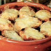 4. Just before you want to serve the beef, pre-heat the grill, spread the croutons with the mustard and sprinkle them with the grated Gruyère, then arrange them on top of the meat and pop the casserole under the grill until the cheese is bubbling. Then serve straight away.